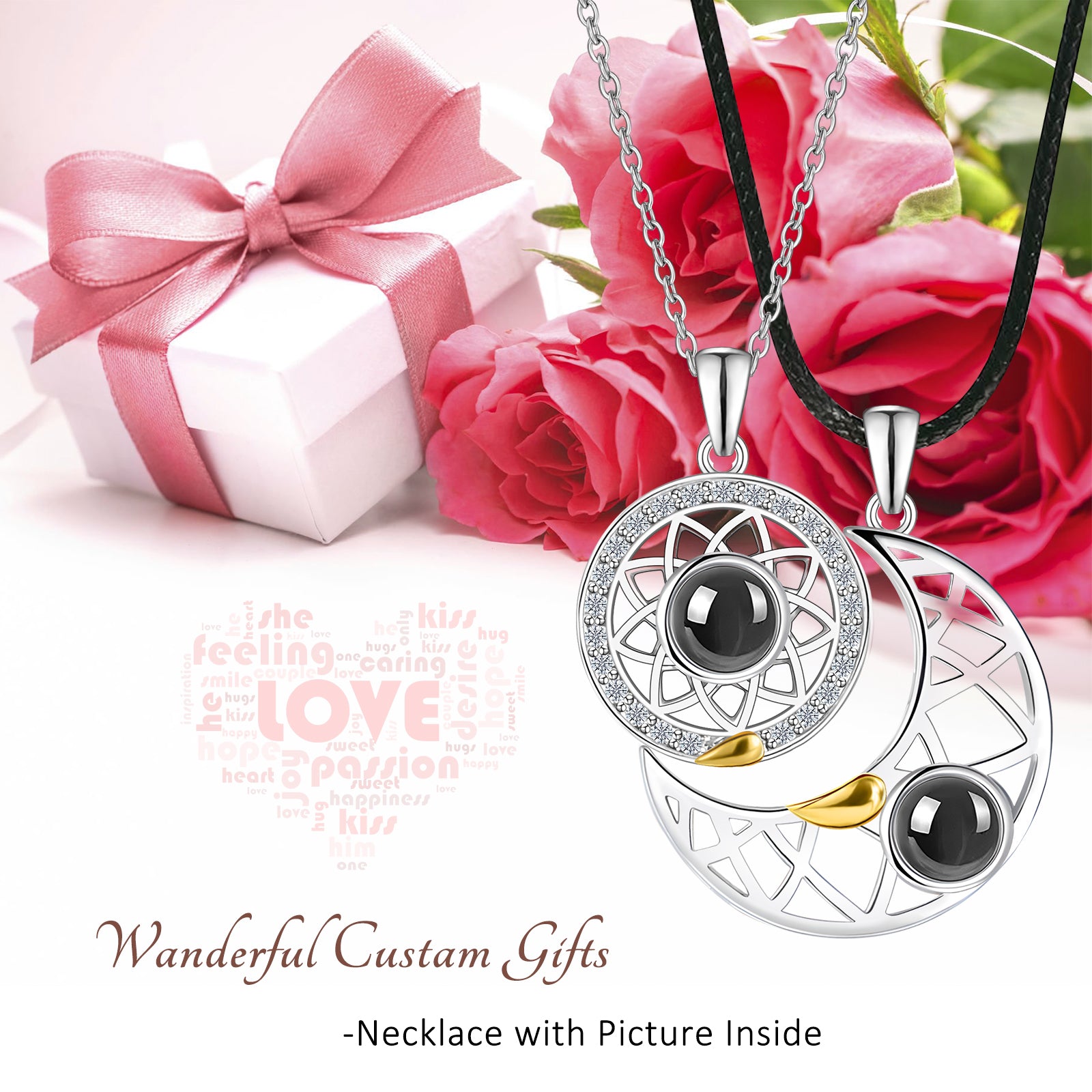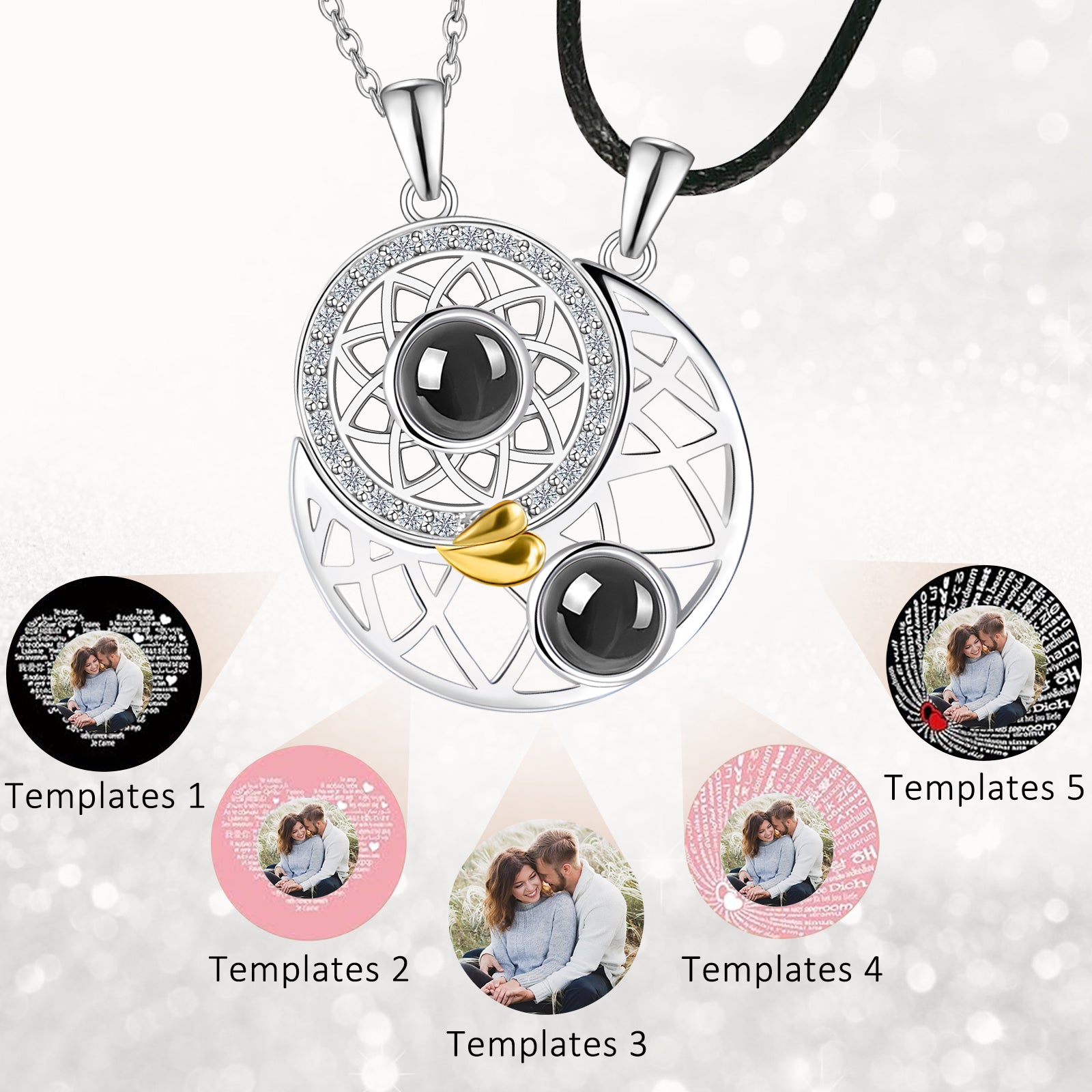- Individuelle Fotoprojektion : Der zentrale schwarze Edelstein in jedem Anhänger kann so angepasst werden, dass er Ihr ausgewähltes Foto mithilfe der mitgelieferten Paarvorlagen oder eines persönlichen Bildes projiziert.
