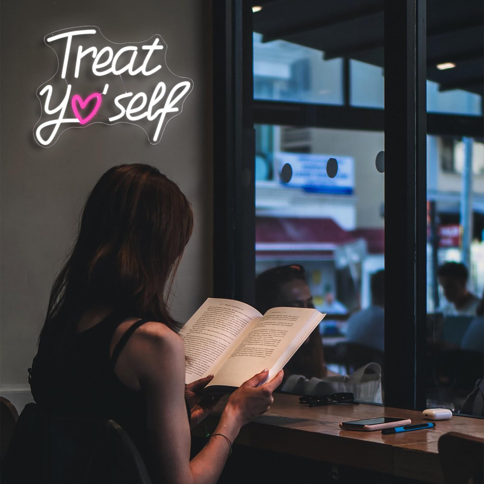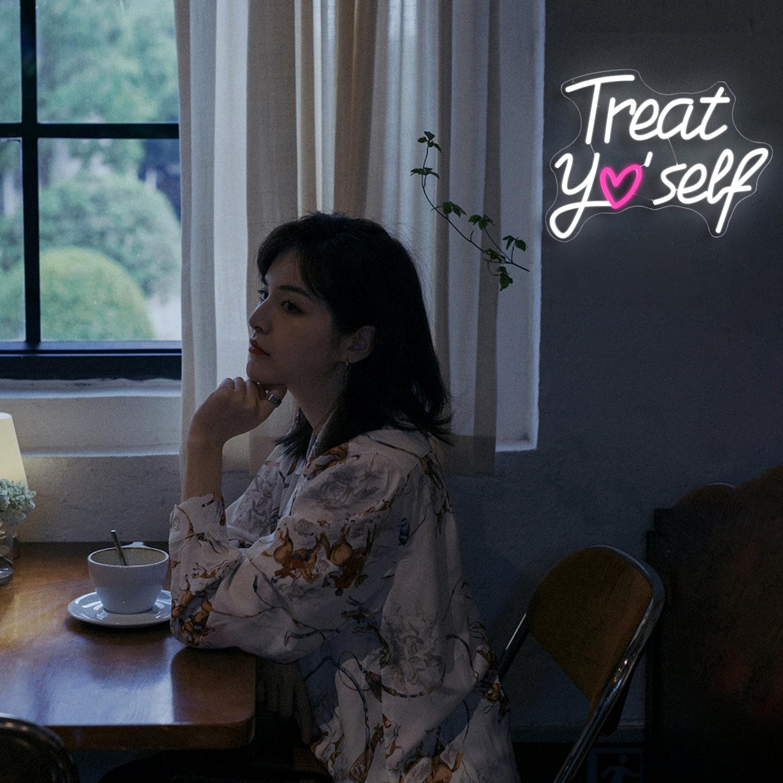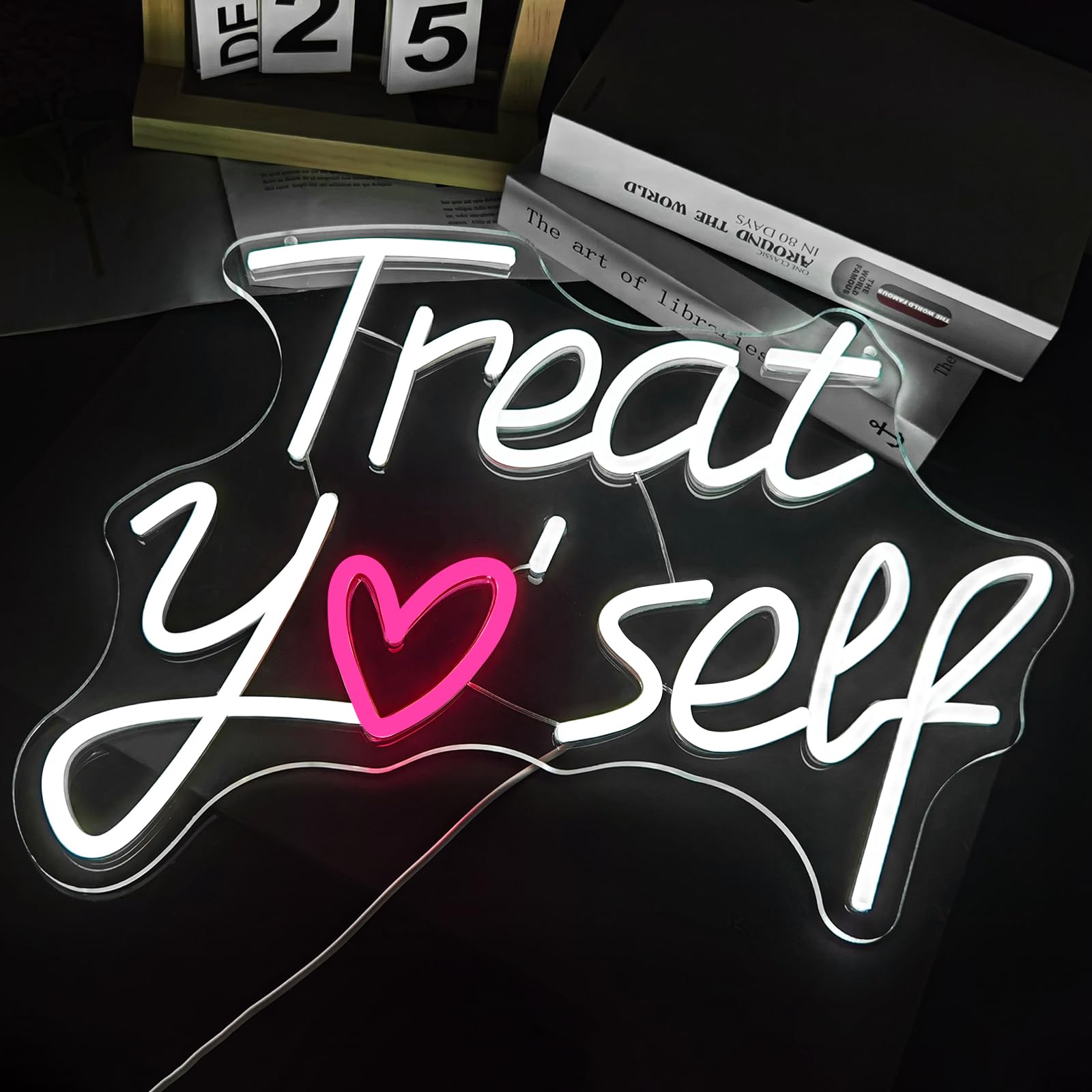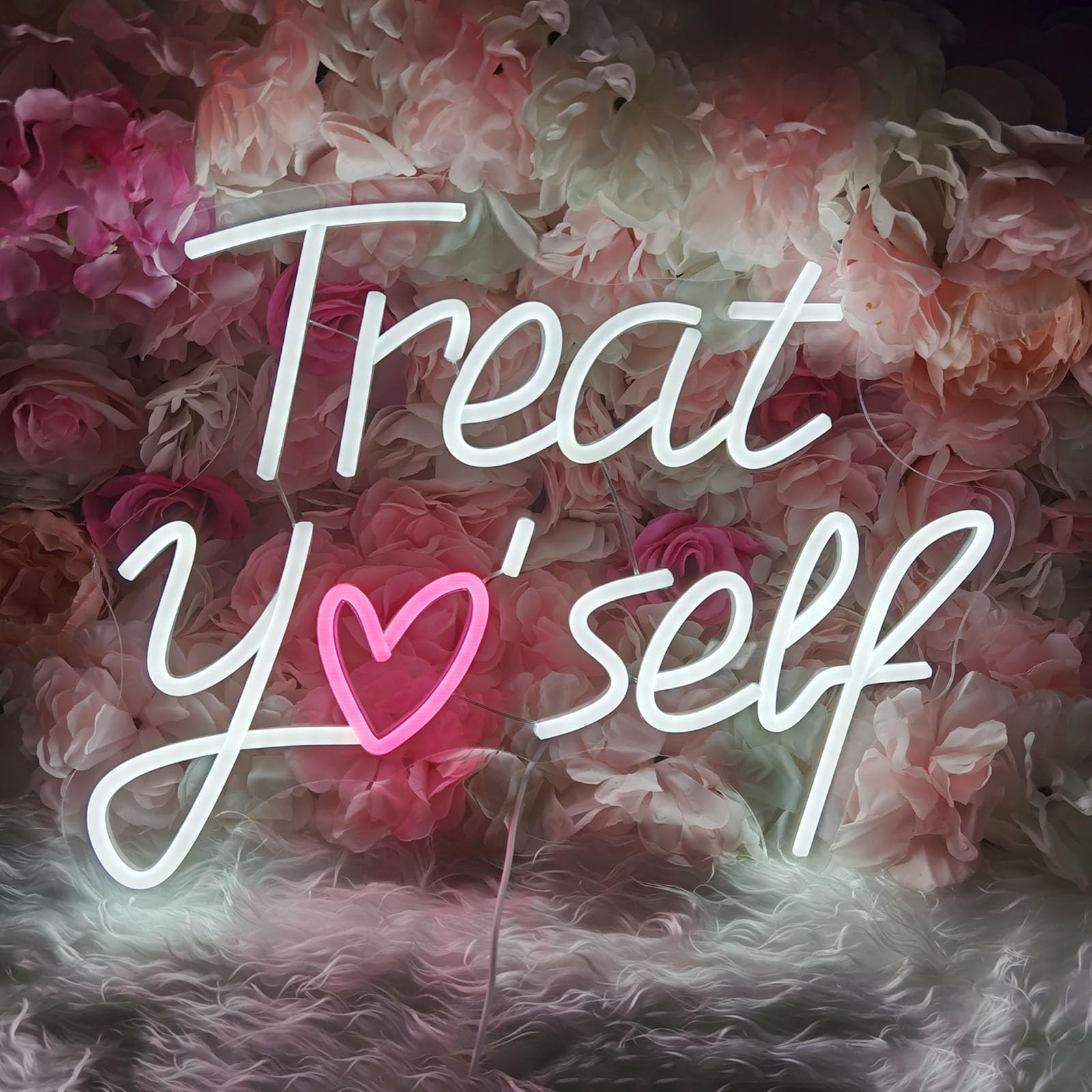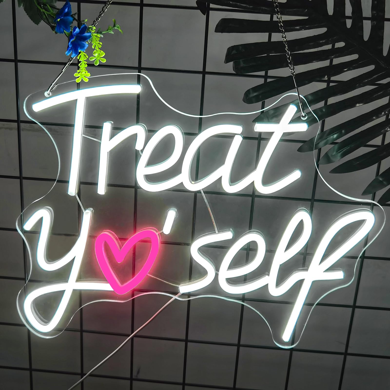 Feiere dich jeden Tag mit diesem inspirierenden Neon-Schild „Treat Yo Self“. Sein verspieltes Design ersetzt den Buchstaben „o“ durch ein bezauberndes rosa Herz und strahlt eine Botschaft der Selbstliebe in einem sanften, einladenden Licht aus. Vor einem gemütlichen Hintergrund wird es zu mehr als nur Dekoration – es ist eine tägliche Erinnerung daran, dein eigenes Glück und Wohlbefinden in den Vordergrund zu stellen.