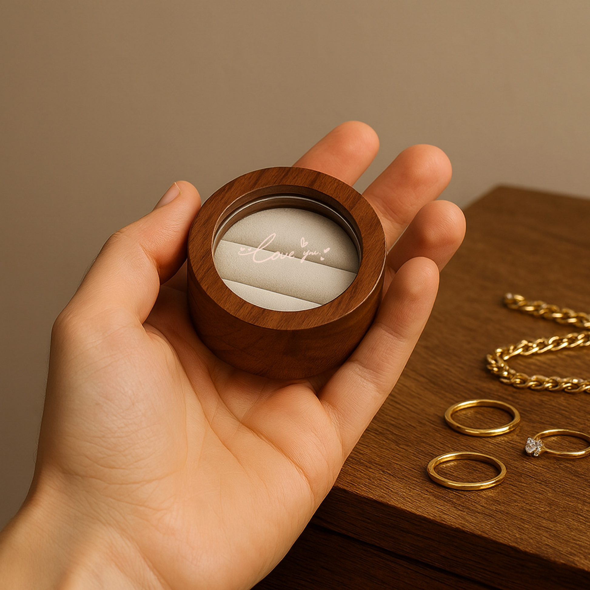 - Personalisierte Klarheit : Das durchsichtige runde Fenster im Deckel kann mit Ihrem Wunschtext – einem Namen, einem Datum oder einem aussagekräftigen Satz – sowie einer Auswahl dezenter Hintergrundmuster individuell gestaltet werden, wodurch jedes Stück zu einem echten Unikat wird.