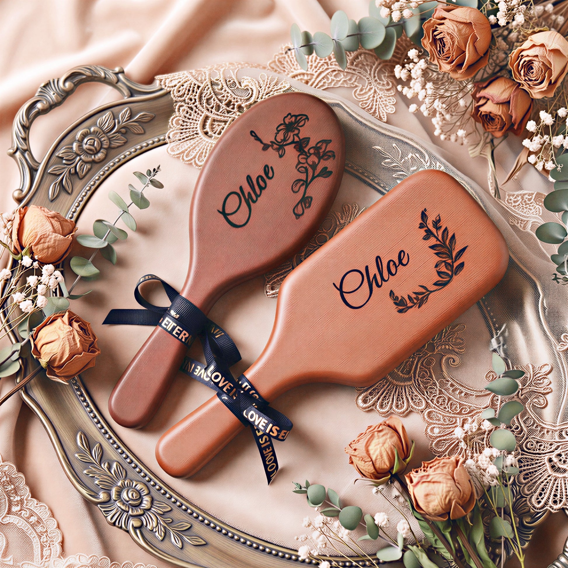 Brosse plate en bois personnalisée - Brosse démêlante personnalisée avec motif floral et nom gravé