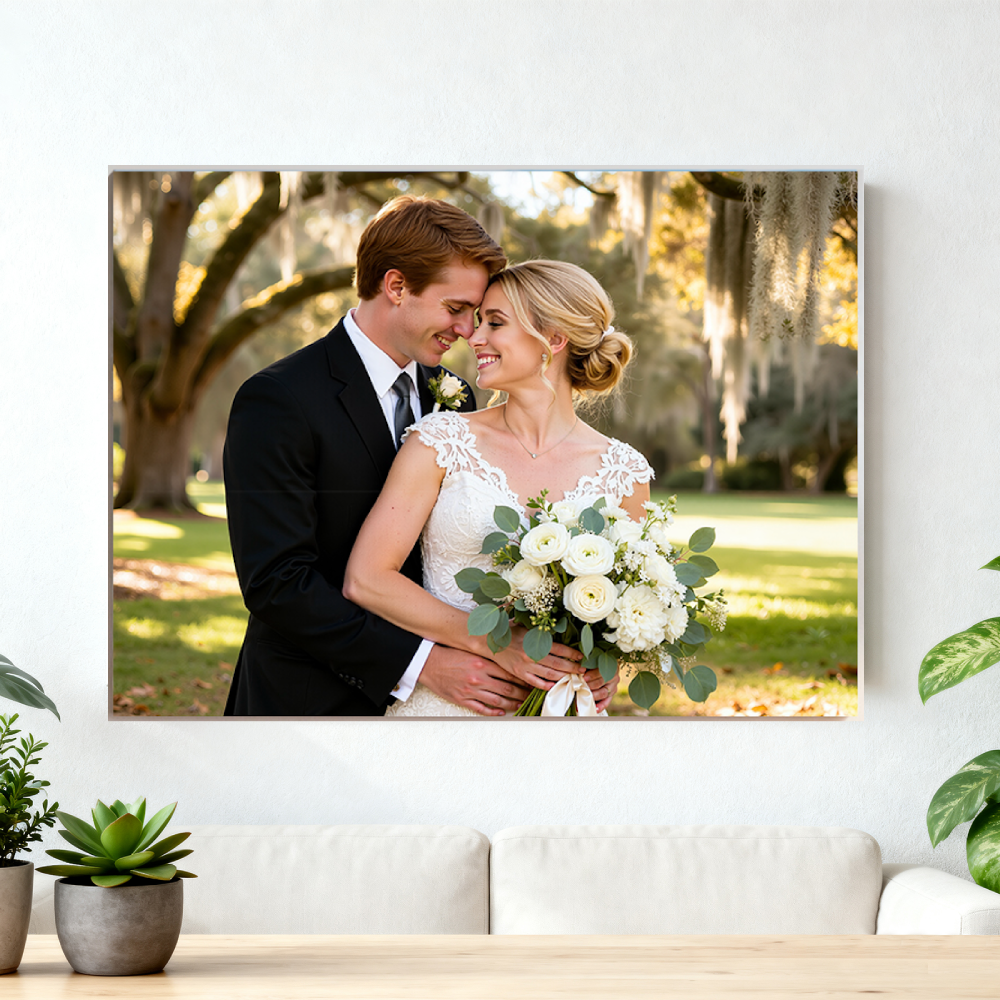 - Votre moment, immortalisé avec maestria : Téléchargez la photo qui définit votre histoire mémorable, peut-être une image aussi inspirante que celle du couple enlacé sous le chêne, baigné de soleil et entouré de mousse espagnole. Nous veillons à ce que chaque détail, de la dentelle de sa robe à l’expression de son regard, soit reproduit avec une fidélité exceptionnelle sur une toile tendue sur châssis.