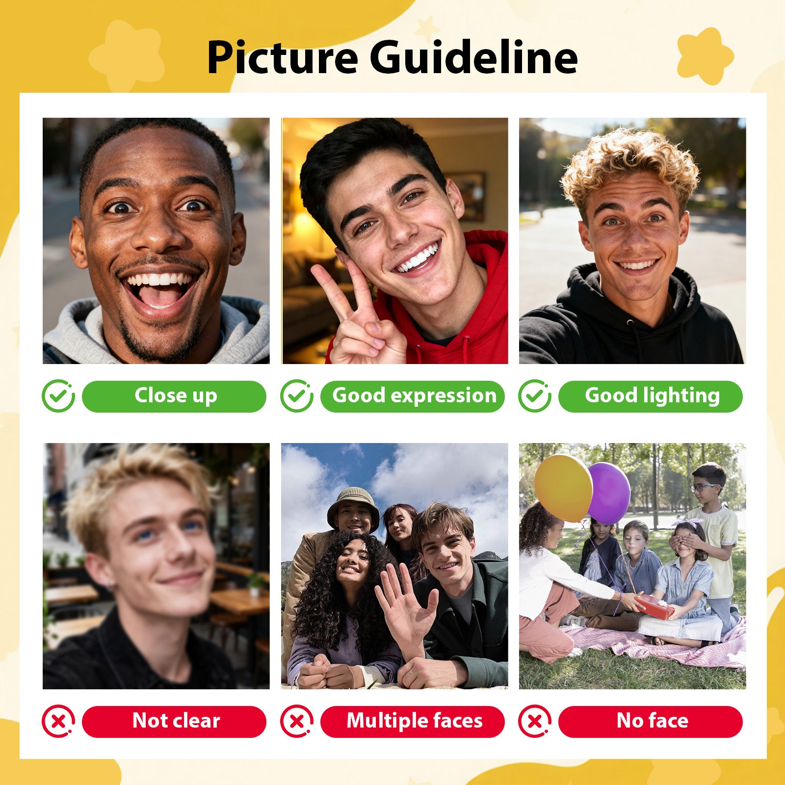 - A Collage of Happy Faces: Upload clear, smiling photos of your loved ones—family, friends, even pets! We’ll integrate them seamlessly into the festive pattern, creating a joyful crowd just like in the reference image.