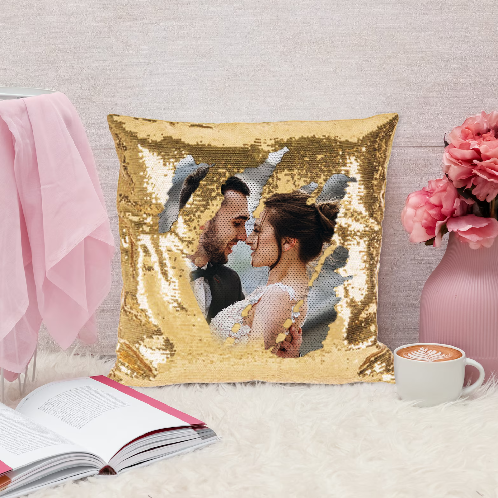 Surprise and delight with a magical custom glitter pillow! Gently swipe the golden sequins to reveal a hidden photo or a secret message. It’s an unforgettable, interactive gift that turns any moment into a treasure.